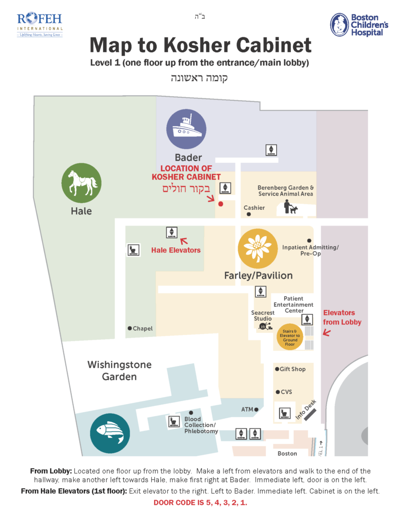 ROFEH is pleased to offer a fully stocked Kosher cabinet at Boston Children’s Hospital. Visitors will find fresh, cold food, Cholov Yisrael milk, cheese, and yogurt, snacks, microwavable shelf-stable meals, coffee, drinks, and more.